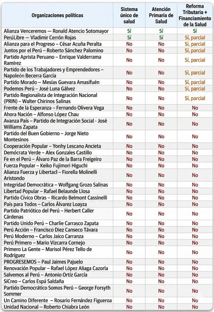 Los hallazgos muestran una débil centralidad de la salud como eje estructural en la competencia electoral: solo una OP (2.8%) plantea las tres propuestas claves en forma completa (Alianza Venceremos), una segunda OP (2.8%) plantea las tres, pero de forma parcial (Perú Libre), 7 OP (20%) plantean únicamente una de las propuestas clave, también en forma parcial, y 26 OP (74.3%), entre ellos Fuerza Popular, Renovación Popular, Ahora Nación, País para Todos y Buen Gobierno, no plantean ninguna de ellas. Este patrón revela no solo la escasa presencia de propuestas estructurales en salud, sino también la persistencia de una visión restringida del sector, tratándolo más como un problema administrativo o prestacional que como un campo político estratégico de reforma estatal y garantía de derechos sociales.